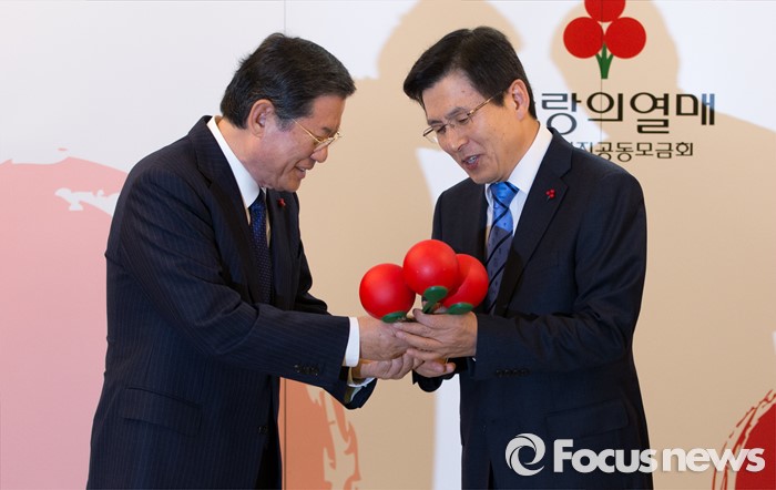 (서울=포커스뉴스) 황교안(오른쪽) 국무총리가 27일 오전 서울 종로구 정부서울청사에서 열린 사랑의 열매 전달식에서 허동수 사회복지공동모금회장으로부터 사랑의 열매 모형을 전달 받고 있다.
