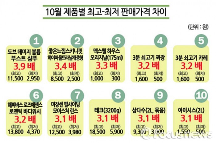 10월 한 달 간 최고·최저 가격 차이가 가장 컸던 제품은 유니레버코리아 도브 데미지 볼륨 부스트 샴푸(780㎖)로 유통업태에 따라 3.9배 차이가 났다.