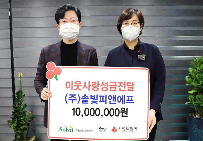 고양시 덕양구 창릉동에 위치한 ㈜솔빛피앤에프는 2005년에 창립해 건강기능식품을 생산·공급하고 있는 업체로 2019년부터 매해 지역의 소외된 이웃들을 위한 사회공헌을 실현하고 있다. ㈜솔빛피앤에프는 작년 에 나눔 및 기부문화 확산에 기여한 공적을 인정받아 도지사상을 수상한 바 있다.