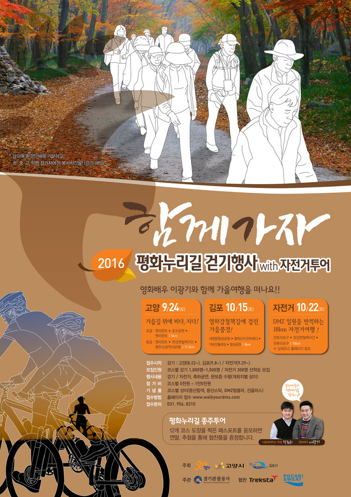 참가신청은 오전 10시부터 공식홈페이지(www.walkyourdmz.com)에서 신청가능하며 모집은 선착순 1,000명(걷기행사), 300명(자전거투어)이고, 참가비는 1만5천원(걷기행사), 1만원(자전거투어)이다.