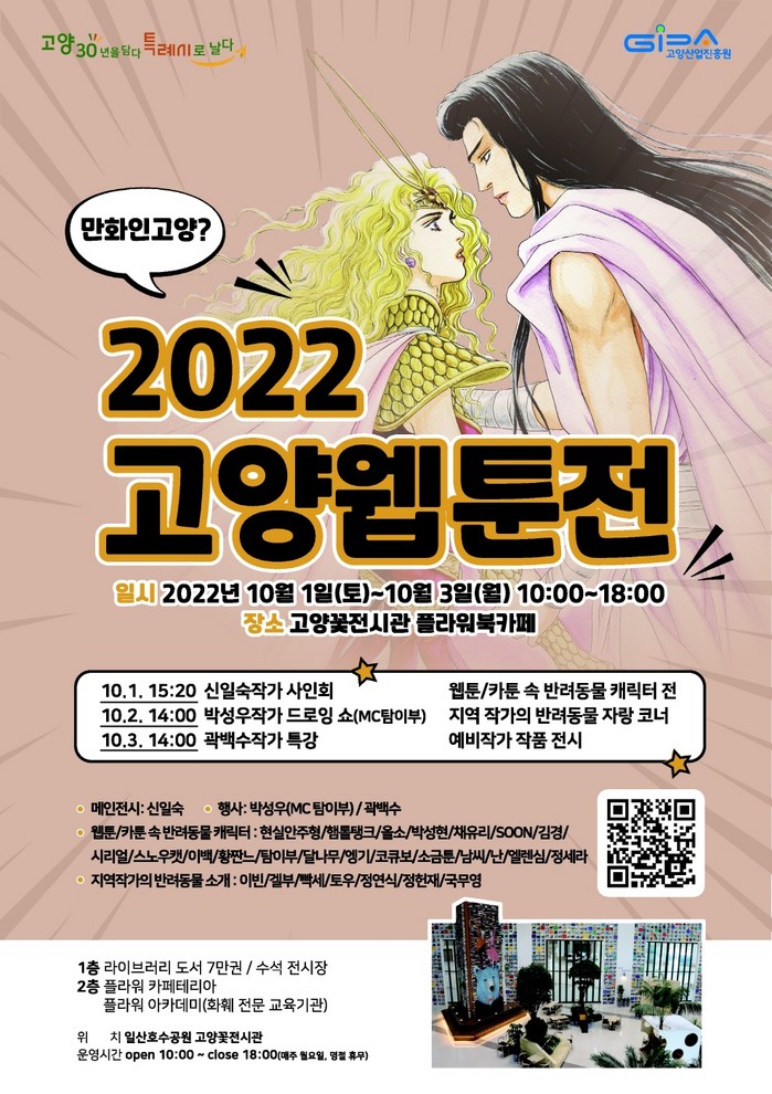 [부자동네타임즈 김인수기자] 고양특례시(시장 이동환)와 고양산업진흥원(원장 오창희, 이하‘진흥원’)은 오는 10월 1일(토)부터 3일(월)까지 고양꽃전시관 플라워북카페에서 <2022 고양 웹툰전>을 개최한다.