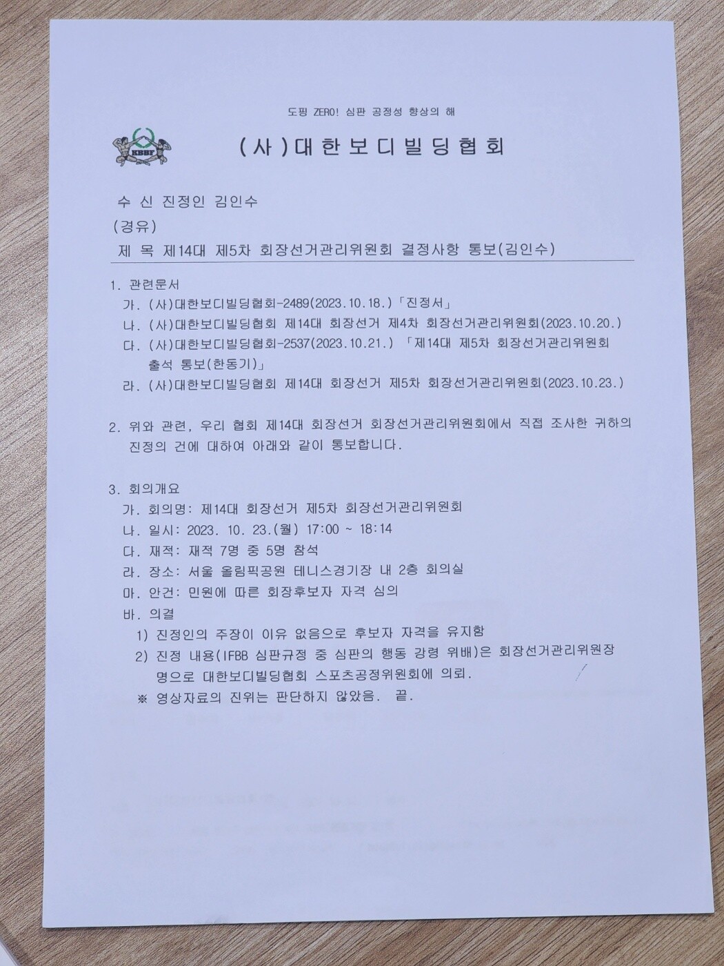 [사진설명] 제14대 제5차 회장선거관리위원회결정사항 통보서.