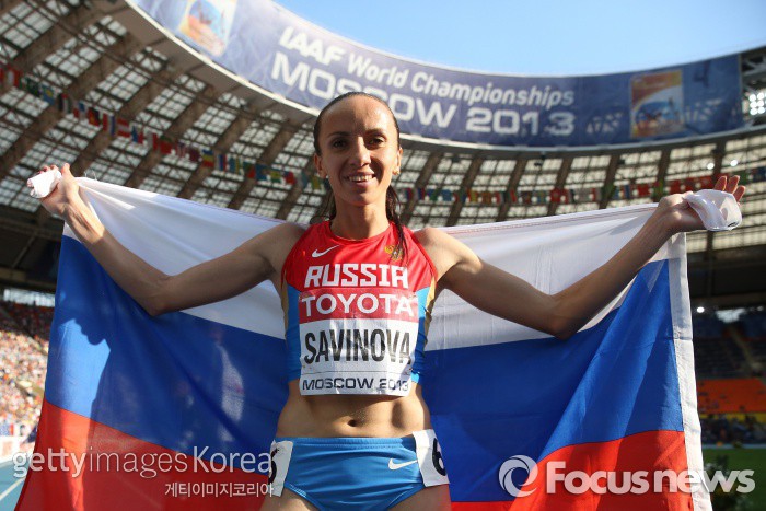 | △ <모스크바/러시아=게티/포커스뉴스> 러시아 육상선수 마리야 사비노바가 2013년 8월18일(한국시간) 러시아 모스크바에서 열린 제14회 모스크바세계육상선수권대회 여자 800m에서 은메달을 차지한 뒤 환호하고 있다. (C)게티이미지/멀티비츠 |