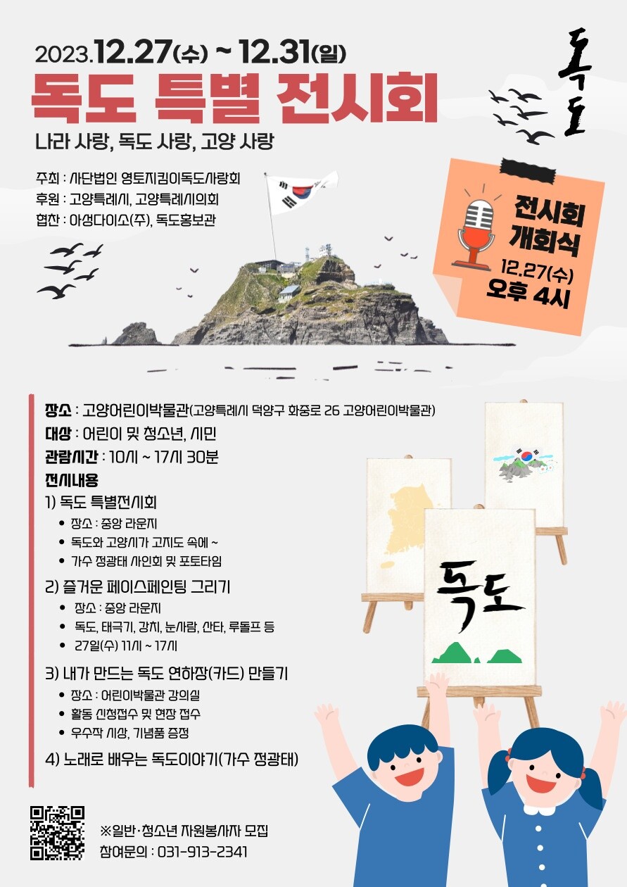 [부자동네타임즈 = 김인수 기자] (사)영토지킴이독도사랑회(이사장 이운주)가 주최하고 고양특례시가 후원하는 ‘2023 독도 특별전시회’가 12월 27일부터 31일까지 고양시 어린이박물관에서 열린다.