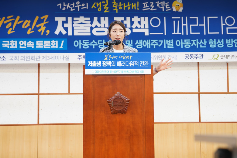 13 일 ( 목 ), 강선우 더불어민주당 의원 ( 서울 강서갑 , 보건복지위원회 간사 ) 은 < 멸종위기 대한민국 , 저출생 정책의 패러다임적 전환 > 이라는 주제로 국회에서 토론회를 열고 ‘ 아동수당의 확대 및 생애주기별 아동자산 형성 방안 ’ 에 대한 전문가들의 의견을 모았다 . 공동주관으로 굿네이버스 · 세이브더칠드런 · 초록우산어린이재단이 함께했다 .