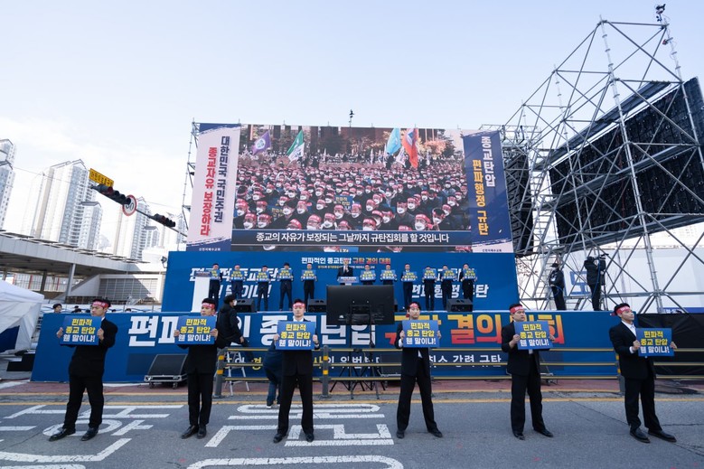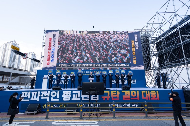 이에 대해 신천지예수교회는 앞선 입장문 등을 통해 "대관 당일 취소는 편파적 종교탄압이고 헌법 제20조 종교의 자유와 정교분리 원칙을 위반한 것"이라며 "정치가 종교에 간섭하여 종교의 자유를 침해하고 두 개의 국민을 만든 것"이라고 비판했다.
