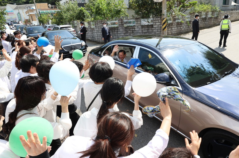 3. 지난 6월 30일 전남 순천 신천지 순천교회에 방문을 마친 이만희 총회장을 환송하기 위해 나온 교인들의 모습.