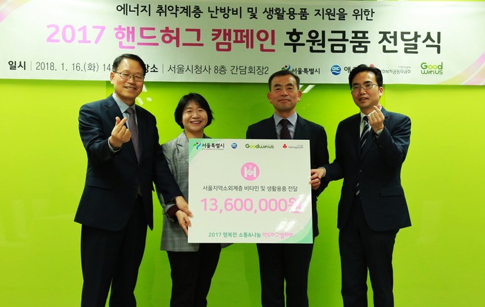 사진설명 : 1월 16일서울시청에서왼쪽부터굿위드어스임통일이사장, 애경산업임금희차장, 서울특별시김인철복지본부장,사회복지공동모금회김효진본부장이핸드허그캠페인후원금품전달식에서기념촬영을하고있다.