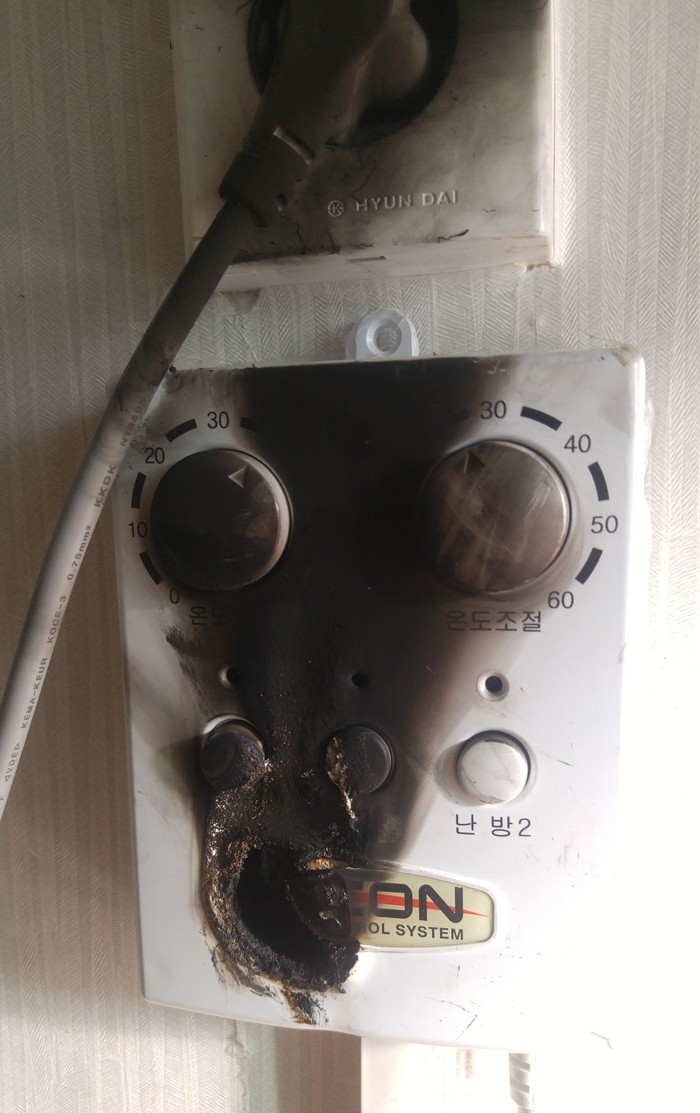 가정집 주인에 따르면 "지난 27일 새벽 1시경 집에서 전기필름 장판을 가동하고 잠이 들었는데 이상한 냄새에 눈을 떠보니 룸스위치(온도조절기)에서 활활 불이 붙어 타고 있었다"고 밝혔다.