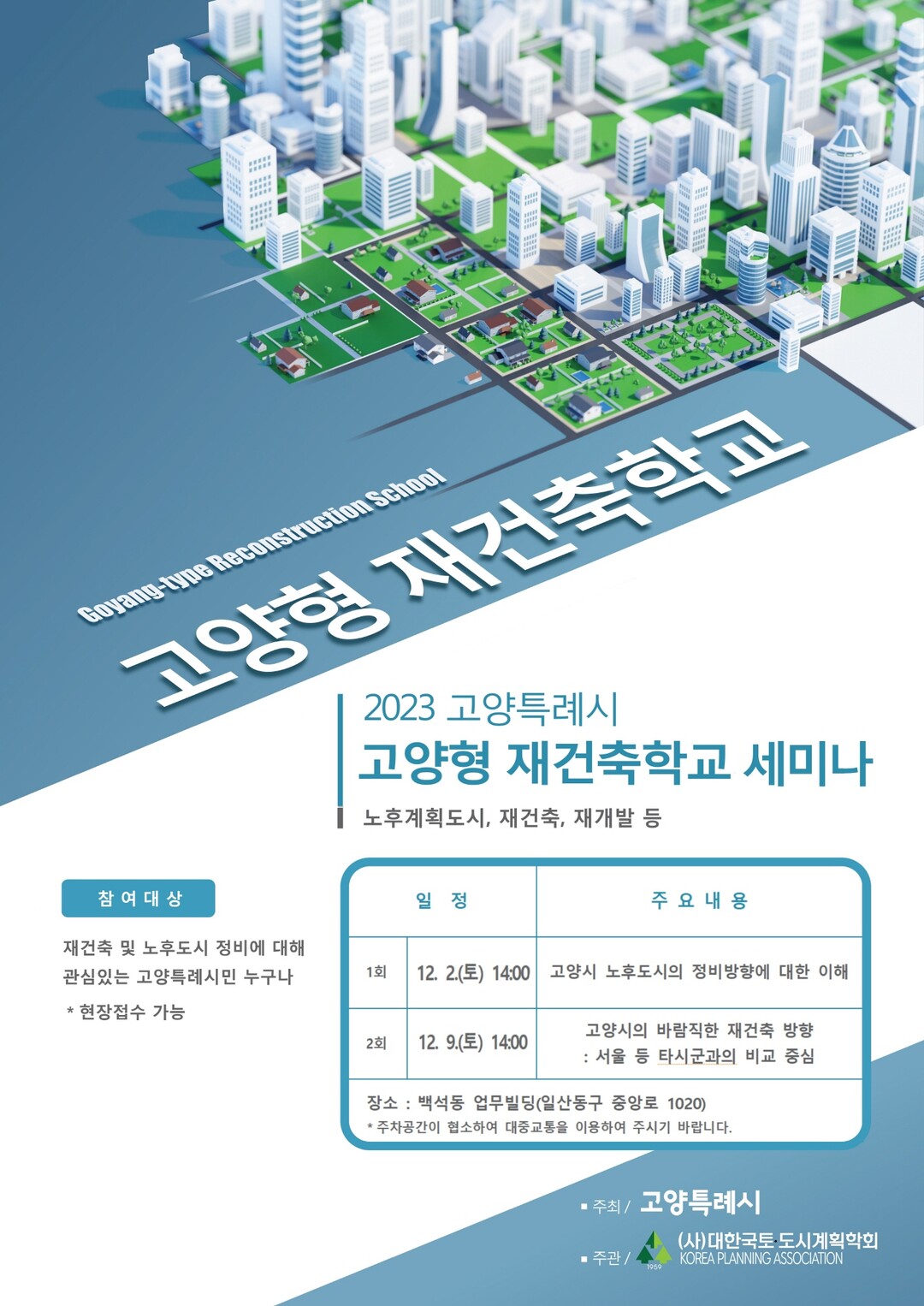 특히, 재건축 학교 교육에 이어 진행되는 세미나에서는 고양시 노후도시 정비방향과 고양시의 바람직한 재건축 방향 등에 대해 다룰 예정이다.