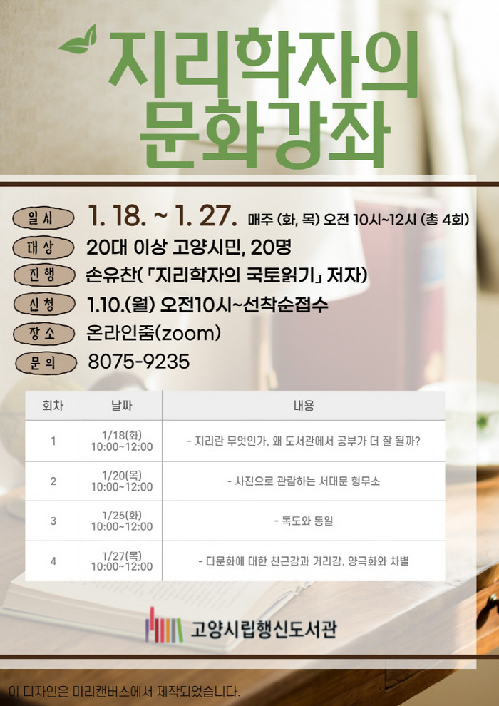 [부자동네타임즈 김인수기자] 고양시 행신도서관이 성인을 대상으로 1월 18일(화)부터 지리학과 인문학을 접한 ‘지리학자의 문화강좌’ 프로그램을 온라인으로 운영한다.