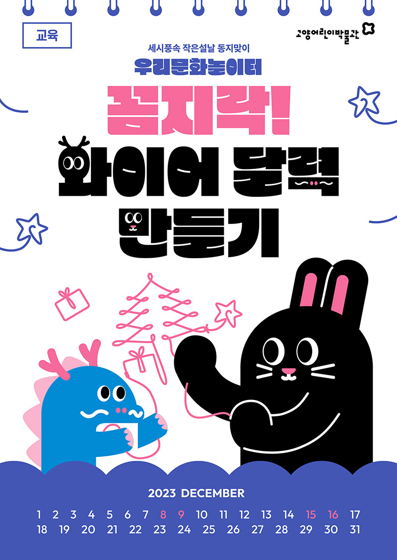 [부자동네타임즈 = 김인수 기자] 고양어린이박물관(관장 조현영)이 오는 12월 8일(금)부터 16일(토)까지 매주 금·토요일에 판소리와 달력을 주제로 한 연말 시즌 교육 ‘우리문화놀이터’를 진행한다.