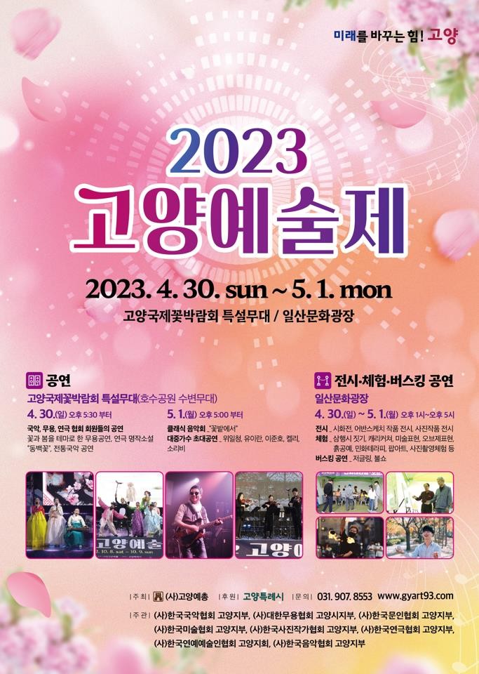 이번 예술제는 ‘예술, 꽃으로 피우다’라는 주제로 열린다. 4월 30일 오후 5시 고양국제꽃박람회 수변무대에서 열리는 개막식을 시작으로 오는 5월 1일까지 국악, 무용, 연극, 연예, 음악의 5개 분야의 공연이 다채롭게 펼쳐진다. 하지혜 전문MC의 사회로 위일청, 소리비, 경기교방춤연구원예술단, 남도굿거리 기악단, 연극 ‘ 동백꽃’ 등 다양한 장르의 공연이 진행될 예정이다.