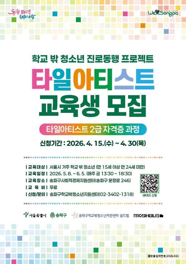 [부자동네타임즈=이병도 기자] 송파구는 서울시 ‘약자와의 동행’ 공모사업으로 학교 밖 청소년들의 사회진입과 자립을 돕기 위한 ‘타일아티스트 교육’을 실시한다고 24일 밝혔다.