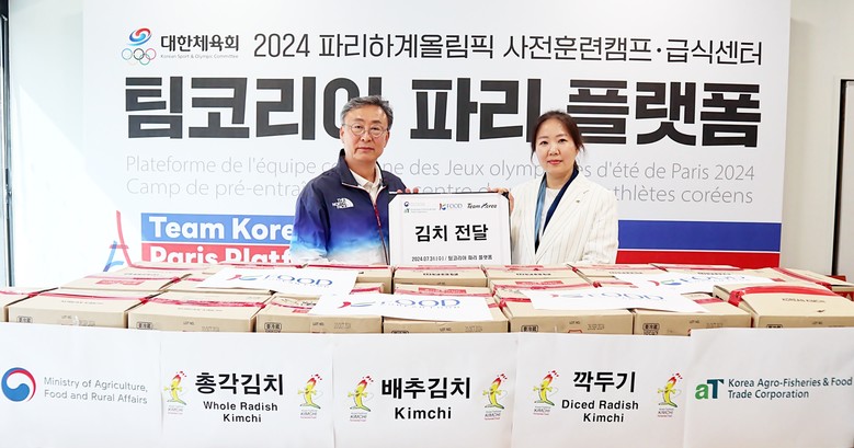 한국농수산식품유통공사(사장 김춘진)는 현지시간 7월 31일 프랑스 퐁텐블로시에 위치한 팀코리아 파리플랫폼에서 ‘국산 김치 전달식’을 갖고 대회 마지막까지 태극전사들의 건강한 선전을 기원했다.