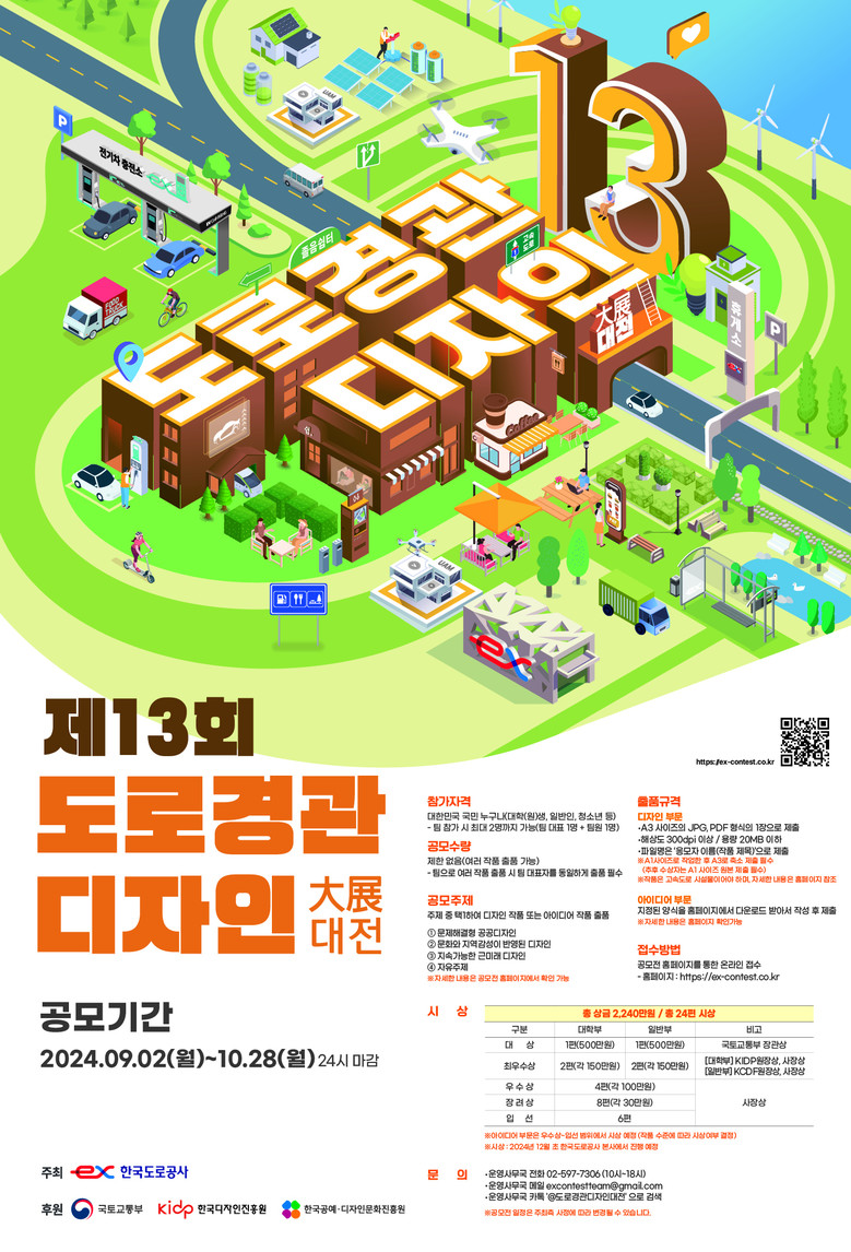 접수된 작품은 11월 중 대학부와 일반부로 구분해 심사를 진행할 예정이며, 12월 중 대상 각 1편(국토교통부 장관상/상금 500만원)과 최우수상 각 2편(한국도로공사 사장상과 한국디자인진흥원 원장상 등/상금 150만원), 우수상 등 총 24편을 선정해 시상한다.