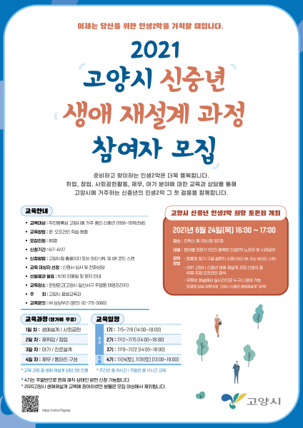한편, 시는 이번 과정과 더불어 오는 24일 킨텍스 제1전시장에서‘고양시 신중년 인생 2막 희망 토론회’를 개최, 전문가와 함께 행복한 인생 2막의 노하우 및 다양한 사례를 공유할 예정이다. 포스터 하단에 표기된 URL 또는 QR코드를 스캔해 구글 설문지로 신청하면 된다.