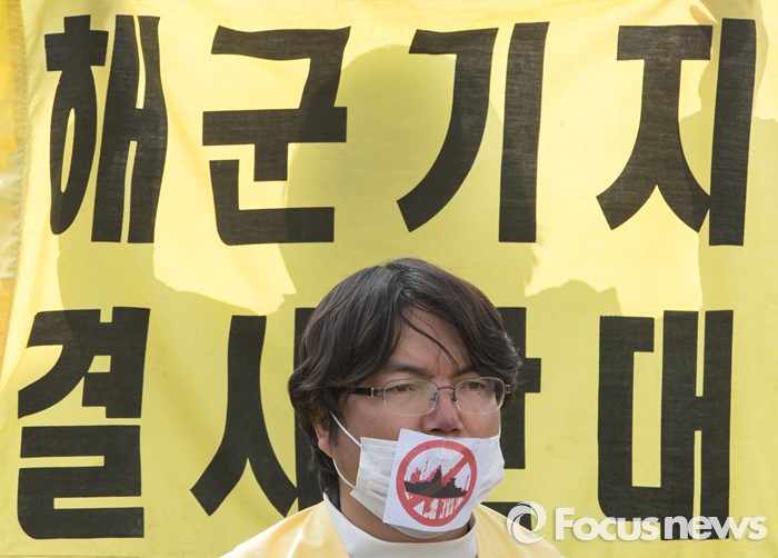 (제주도=포커스뉴스) 1일 오후 제주민군복합항 앞에서 강정마을 주민들을 비롯한 천주교 사제들이 해군 제주기지전대 창설에 즈음한 기자회견을 하고 있다.