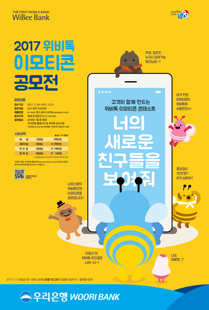 [부자동네타임즈 이현재 기자]우리은행은 자체 메신저인 위비톡의 이모티콘 공모전 ‘너의 새로운 친구들을 보여줘’를 실시한다고 28일 밝혔다.