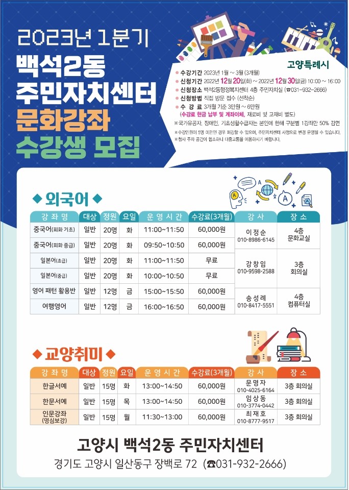 [부자동네타임즈 김인수기자] 고양특례시 일산동구 백석2동 주민자치회에서는 12월 20일부터 2023년 1분기 주민자치센터 문화강좌 프로그램 수강생을 모집한다.