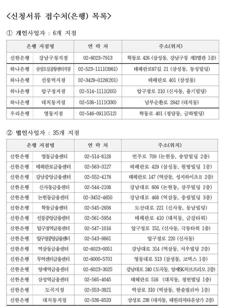 이번 상반기 지원의 가장 큰 특징은 신청 편의를 크게 높인 점이다. 강남구는 기존 10곳이던 접수처를 올해부터 신한은행·하나은행·우리은행과 협력해 총 36개 지점으로 확대했다. 생업으로 시간을 내기 어려운 사업자들이 사업장 인근이나 주거래 은행에서 보다 편리하게 상담과 신청을 할 수 있도록 접근성을 높인 것이다. 구청과 민간 금융기관이 함께 접점을 넓혀 실질적인 이용 문턱을 낮췄다는 점에서 의미가 있다.