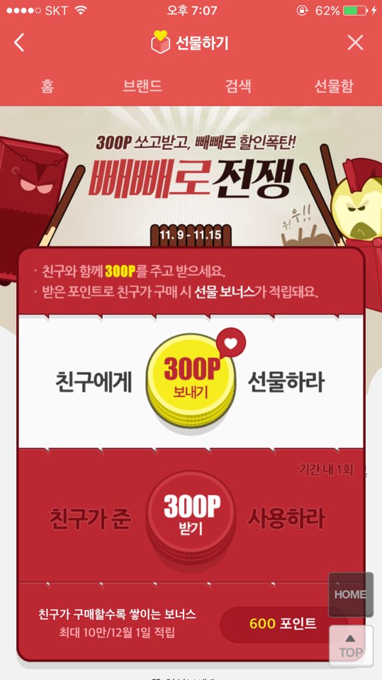 카카오는 빼빼로데이에 맞춰 다양한 프로모션을 준비 했다. 빼빼로 전용 포장지와 메시지 카드를 제공하고 친구들과 관련 프로모션을 공유하면 300 카카오포인트를 지급하는 이벤트를 진행했다.