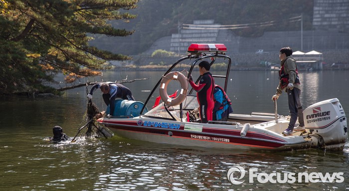 (가평=포커스뉴스) 16일 오전 경기도 가평군 청평댐에서 전문 잠수사 및 시민단체 회원들이 수중 쓰레기를 수거하고 있다.