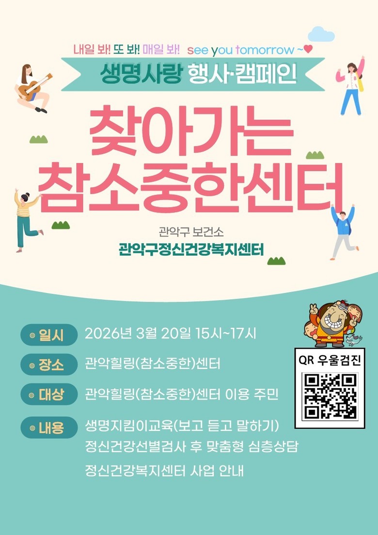 행사는 차 한 잔을 나누는 편안한 분위기 속에서 진행되며, 관악구민이라면 누구나 참여가능하다. 참여 주민들은 ‘우울감 선별검사(PHQ-9)’를 통해 자신의 마음 건강 상태를 면밀히 살피는 시간을 갖는다. 검사 결과에 따라 필요한 경우 전문 상담사의 맞춤형 심층 상담을 즉석에서 제공해 실질적인 도움을 줄 예정이다.