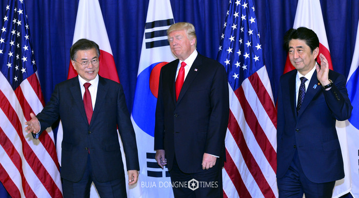 [부자동네타임즈 박윤수 기자]한·미·일 3국 정상이 제72차 유엔총회 기간 중인 오는 21일(현지시각) 미국 뉴욕에서 정상회담을 개최한다. 지난 7월 독일 함부르크에서 열린 주요 20개국(G20) 정상회의를 계기로 처음 마주한 뒤 2개월 만이다.