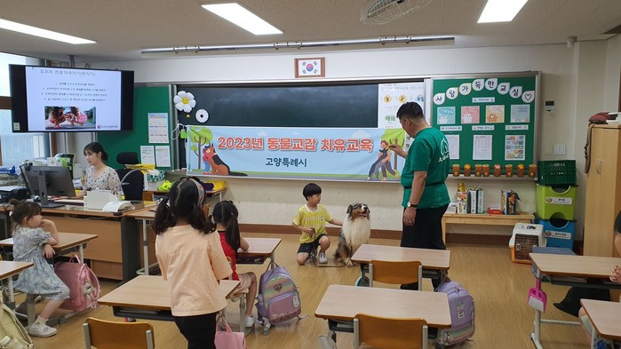 동물교감치유 프로그램의 일환으로 지난 7월 13일 일산초등학교 1학년 교실 훈련사와 훈련견 베베와 캔디가 방문했다. 이날 일산초등학교 1학년 아동은 반려동물 예절 교육을 받고 훈련견과 간단한 상호작용을 하는 시간을 보냈다.