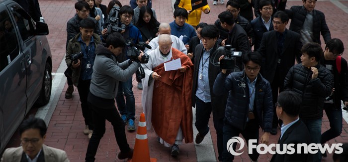 | △ 지난 19일 오후 서울 종로구 조계사에서 조계종 화쟁위원회 위원장 도법 스님이 한상균 민주노총 위원장 신변보호 요청에 대한 화쟁위 회의 결과 발표를 끝낸 후 조계종 건물 안으로 발걸음을 옮기고 있다. <사진제공=포커스뉴스> |