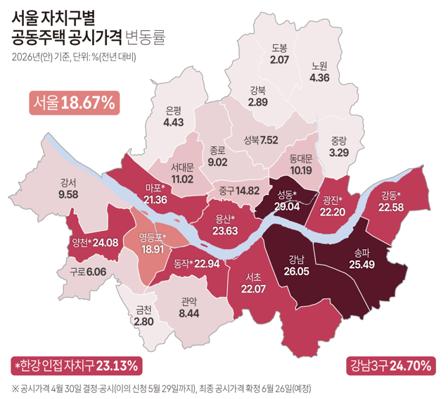 서울은 작년 대비 18.67% 오르며 전국 시도 가운데 유일하게 전국 평균을 웃돌았다. 지난해(7.86%)의 2배가 넘는 상승률이다.현실화율은 동결됐지만 한국부동산원 기준으로 지난해 연간 서울 아파트 매매가격 상승률(8.98%)은 물론 실거래가 상승률(13.49%)까지 크게 웃도는 공시가격이 산출됐다.서울 상승률은 부동산 시장이 활황이던 2021년(19.91%) 이후 최고치이며, 2005년 공동주택 공시제도 도입 이후 세 번째로 높다. 역대 최고 상승률은 '버블 세븐'(강남·서초·송파·목동(앙천)·분당·평촌·용인) 지역 가격이 급등한 시기인 2007년 28.40%다.서울 내에서도 고가 아파트가 밀집한 강남3구의 공시가격 상승률은 24.7%로 서울 전체 평균을 크게 웃돌았다. 강남구가 26.05%, 송파구 25.49%, 서초구는 22.07% 각각 올랐다.