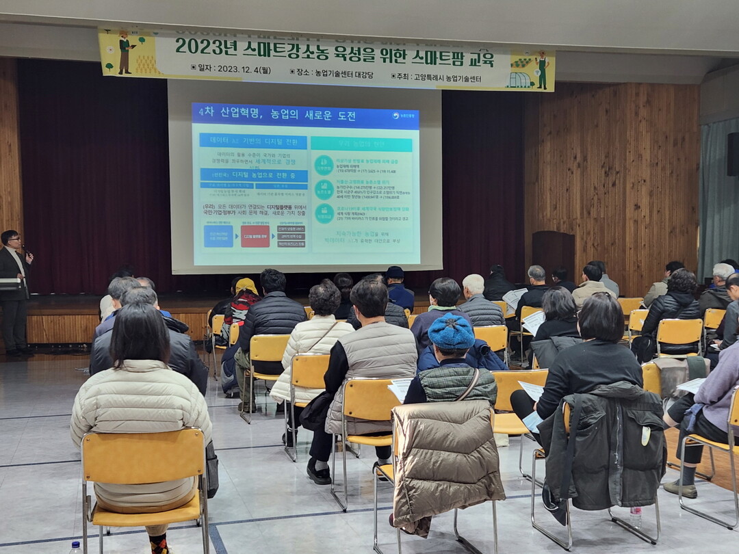 [부자동네타임즈 = 김인수 기자] 지난 4일 농업기술센터 대강당에서 강소농 육성을 위한 지능형 농업(스마트팜) 교육을 실시했다. 교육에는 고양시 강소농 49명이 참여했다.