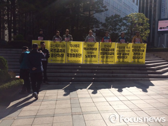 전국교직원노동조합 소속 조합원 20여명은 이날 오전 11시쯤 서울 중구 파이낸스센터 앞에서 '한국사교과서 국정화 반대 교사시국선언' 기자회견을 열었다.