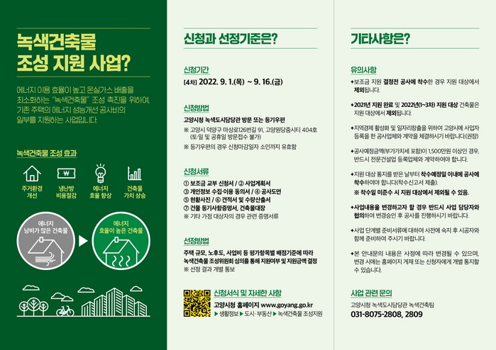[부자동네타임즈 김인수기자] 고양특례시(시장 이동환)가 노후 주택의 에너지 효율 향상과 쾌적한 주거환경 조성을 위해 9월 1일부터 녹색건축물 조성 지원 사업 4차 대상자를 모집한다.