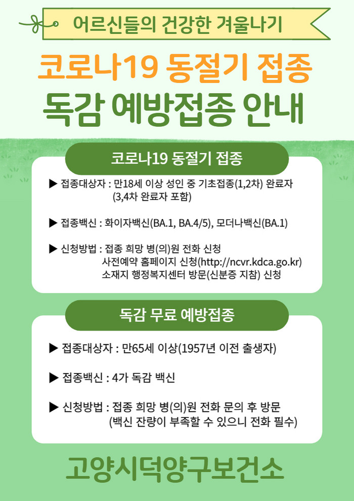 [부자동네타임즈 김인수기자] 고양특례시(시장 이동환)는 겨울철 호흡기 감염병 유행에 대비하기 위해 동절기 코로나19 추가접종과 유행성 독감 예방접종을 실시하고 있다.