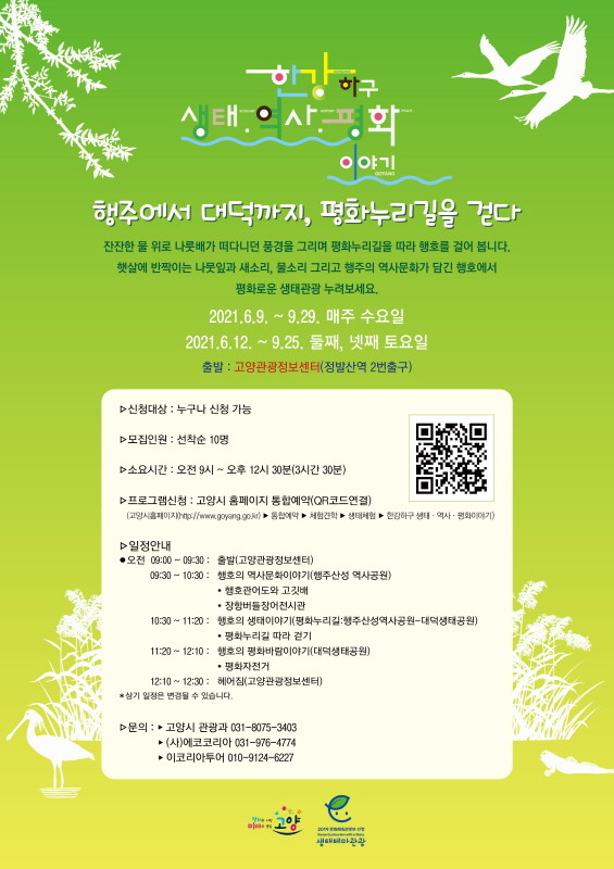 [부자동네타임즈 김인수기자] 고양시는 "코로나19로 지친 시민들의 심신을 위로하기 위해 한강하구 생태·역사·평화이야기를 담은 특별 여행 프로그램을 6월 9일부터 출시한다."고 밝혔다.