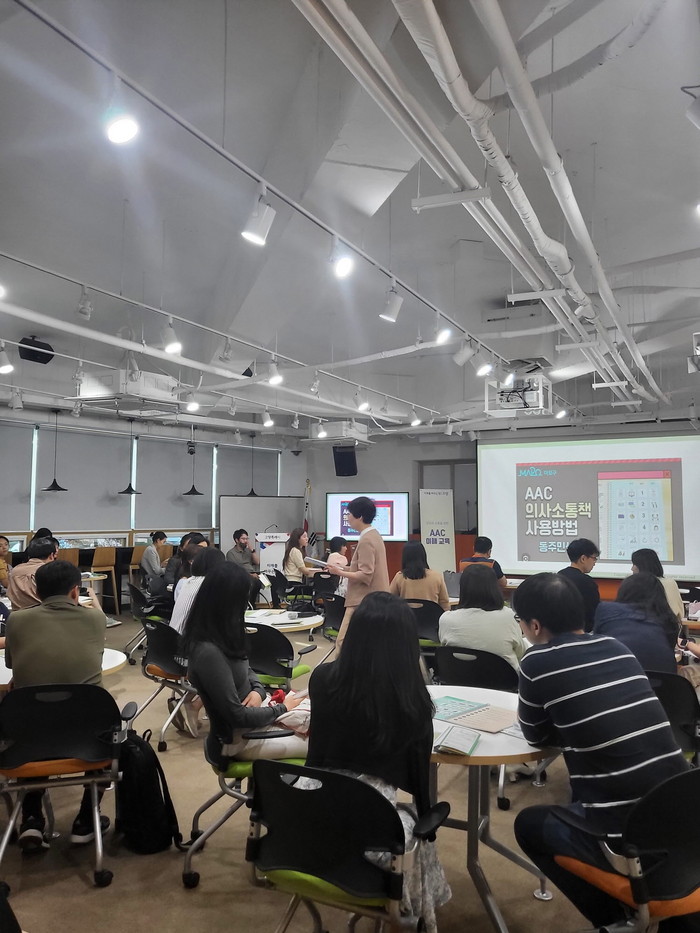 이날 사람과소통 언어치료AAC센터의 김지은 센터장이 강의를 맡아 보완대체의사소통의 필요성과 동 주민센터 및 지구대 파출소 등 일상생활 속에서 사용되는 보완대체의사소통을 소개했다.