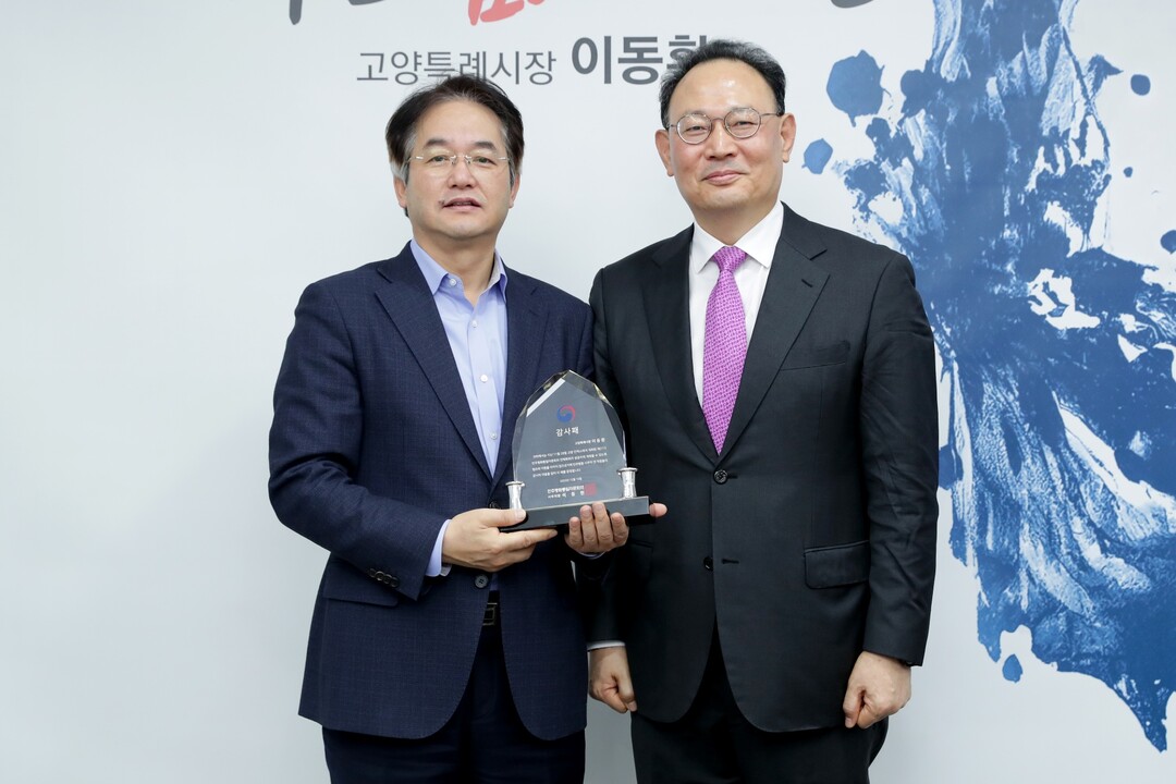 이날 민주평통 중앙사무처 관계자, 민주평통 고양시협의회 주요 임원진이 이동환 고양시장에게 감사패를 전달했다.