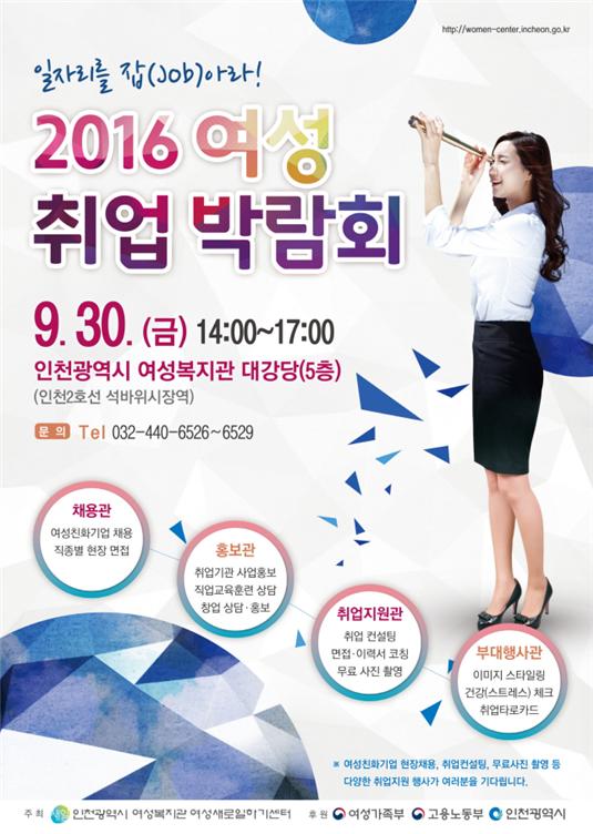 [인천=부자동네타임즈 심동윤 기자]인천광역시(시장 유정복) 여성복지관 여성새로일하기센터는 9월 30일 오후 2시부터 5시까지 여성복지관 5층 대강당에서 여성구직자를 대상으로 「2016 여성 취업 박람회」를 개최한다고 밝혔다.
