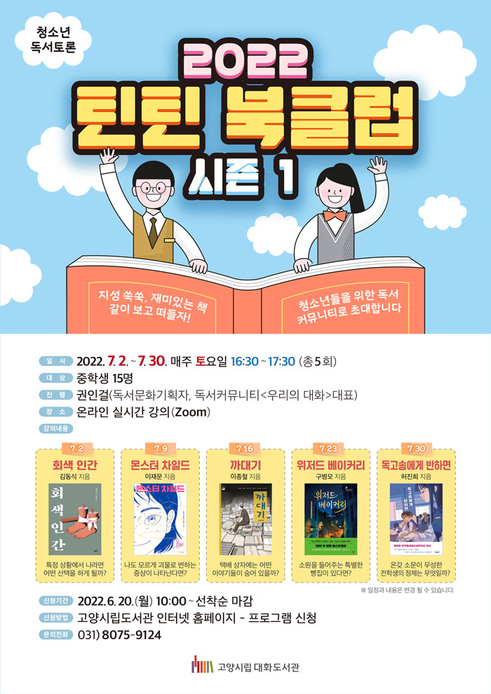 [부자동네타임즈 김인수기자] 고양시 대화도서관은 오는 7월 2일부터 7월 30일까지 매주 토요일 오후 4시 30분부터 청소년 독서토론 프로그램 2022 틴틴 북클럽 시즌1을 온라인으로 운영한다고 밝혔다.