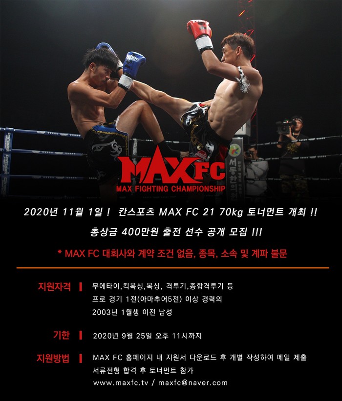 [부자동네타임즈 김인수기자] 국내 입식격투기 웰터급(70kg) 최강을 가리는 토너먼트를 입식격투기 단체 MAX FC(대표 이용복)가 개최한다. 총상금 400만원 규모로 오는 9월 25일(금)까지 출전 선수를 공개모집한다.