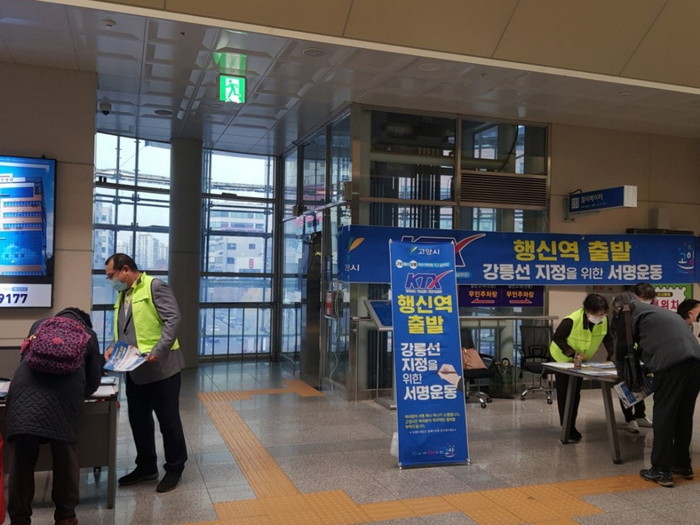 [부자동네타임즈 김인수기자] 고양시 덕양구 행신2동 주민자치회(회장 윤찬수)는 17일(수) 행신역에서 시민을 대상으로 ‘KTX 행신역 발 강릉선 지정’을 위한 거리 서명운동을 진행했다.