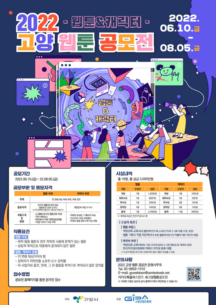 작품 접수는 8월 5일까지이며, 2022년 고양 웹툰 공모전 홈페이지에서 신청서 양식을 내려 받아 작품과 함께 제출하면 된다.