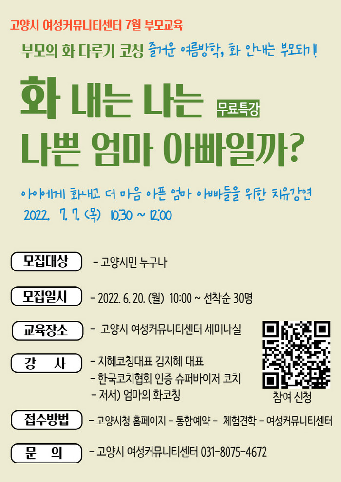 [부자동네타임즈 김인수기자] 고양시 여성커뮤니티센터에서 여름방학을 맞이해 ‘즐거운 여름방학, 화 안내는 부모 되기 ’특강을 진행한다.