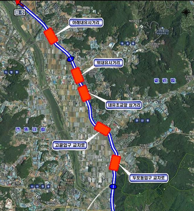 특히 통일로의 5개 교차로(두포동입구, 고골입구삼거리, 내유초등학교, 위내유사거리, 아래내유사거리)는 그 중에서도 정체가 가장 극심했던 곳이다.