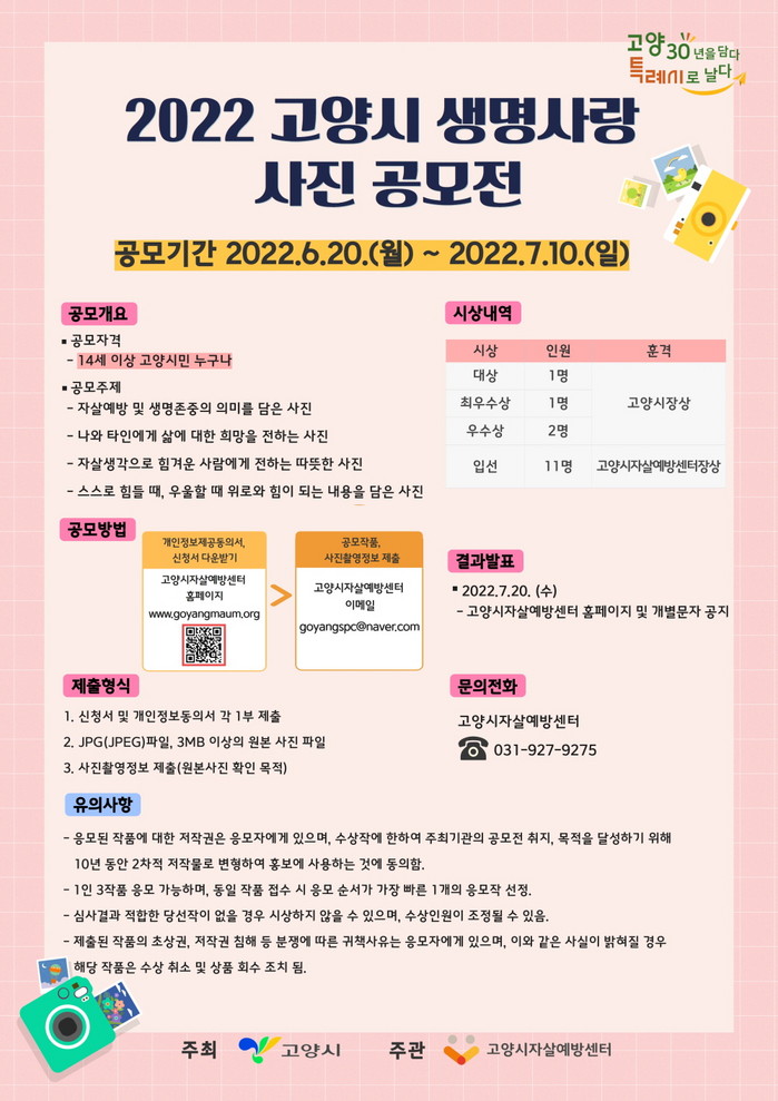 공모전은 자살예방 인식개선에 관심 있는 14세 이상 고양시민이라면 누구나 참여할 수 있다. 접수는 고양시자살예방센터 홈페이지에서 신청서 및 개인정보제공동의서를 다운 받은 후 이메일로 신청 서류와 사진 작품, 사진촬영 정보를 제출하면 된다.