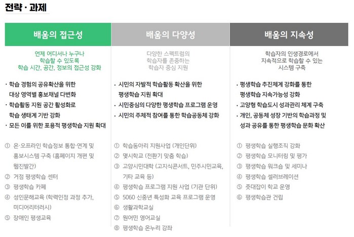 시는 진흥계획 마련을 위해 지난 2016년부터 추진한 ‘평생학습 릴레이포럼’과 다양한 영역과 계층이 참여한 ‘사부작사부작 LAB 시민워크숍’, ‘Co-Creation Team 워크숍’ 등을 통해 평생교육 관계자와 전문가 그리고 시민이 함께 장시간에 걸쳐 협의하고 정리해왔다.