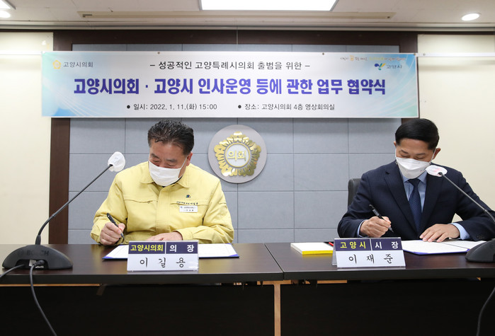 이날 협약식은 1월 11일 의회 4층 영상회의실에서 이길용 의장과 이재준 시장이 참석한 가운데 열렸으며, 지방자치법 전부 개정으로 지방의회 사무직원에 대한 인사 권한이 지방의회 의장에게 부여됨에 따라 차질 없는 업무 수행을 위한 근거를 마련하고 양 기관의 조화로운 업무 이관과 고양시의회 인사권 독립의 안정적 정착을 위해 이뤄졌다.