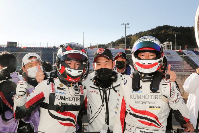 [사진설명] 2020 CJ대한통운 슈퍼레이스 챔피언십 5라운드 슈퍼 6000 클래스에서 우승한 엑스타 레이싱의 노동기(오른쪽)와 이정우(왼쪽)가 김진표 감독과 함께 기뻐하고 있다.